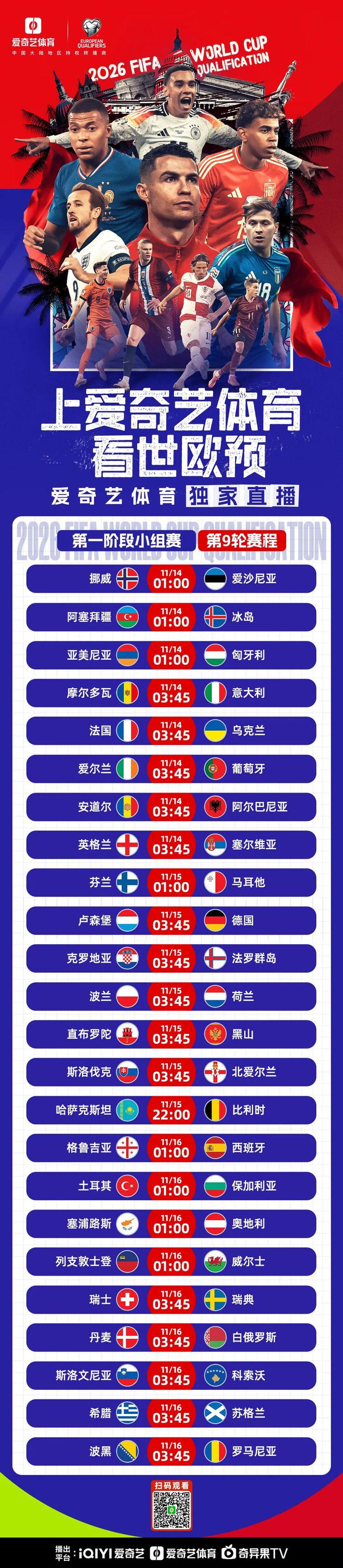 11 月 14 日星期五 03:45 世界杯欧洲区预选赛恢复正常,摩尔多瓦对阵意大利。本轮也是倒数第二轮。意大利男足将作客对阵摩尔多瓦。意大利在I组排名第二,虽然自加图索接任主帅以来球队积分惊人,但无法改变首轮负于挪威的事实。这也意味着对手可以完全控制自己的出线方式。即使最后一轮击败对手,蓝衣军团也未必能够缩小净胜球。目前,挪威队的净胜球为26分,而意大利队只有10分。形势艰难,意大利男足只能拼尽全力,等待对手犯错。本赛季,意大利将客场对阵小组垫底的摩尔达维亚。目标是赢球并扩大净胜球。在第一轮比赛中F场比赛,意大利主场2-0击败摩尔多瓦。与此同时,挪威在第二轮对阵摩尔多瓦的比赛中落后15球(客场5-0,主场11-1)。这可以称为差距。因此,本场比赛意大利队最大的压力将是进球,但近日有消息称基耶萨拒绝了意大利国家队的征召,选择留在利物浦。那么此战加图索主帅可以依靠的进球手是谁呢?这点值得一提。 11 月 14 日星期五 03:45 英格兰 vs 塞尔维亚 三狮军团在世界杯预选赛第九轮比赛中在温布利主场迎战塞尔维亚。由于参加世界杯决赛已经提前确定,图赫尔的球队本场比赛将打得轻松。目前,英格兰男足是唯一确认参加世界杯的欧洲球队。这给了团队适应的空间和信心。英格兰男足助理教练巴里在接受采访时承认,这批球员可以用来赢得世界杯。事实上,近年来英格兰足球人才激增。贝林厄姆和福登再次回到这个主题的列表中。皇马和曼切的中场球星星城的英超MVP最近在各自的俱乐部表现出了恢复竞争力的能力,这一点令人满意。同时,我们也不要忘记凯恩,他是目前欧洲足坛最有天赋的前锋。这位三狮军团队长实现了随拜仁取得16连胜的壮举。本赛季他在各项赛事中已经打进23球,无人能阻止他这样做。塞尔维亚目前在K组排名第三,仍有晋级希望。十月初,球队更换了教练。中国球迷熟悉的斯托伊科维奇辞职,由帕乌诺维奇接任。两队首轮比赛,英格兰队以5-0击败对手。本场比赛三狮军团的进攻节奏难以阻挡徽章。 11月14日(周五)03:45 爱尔兰VS葡萄牙 世界杯预选赛第9场比赛,葡萄牙男足客场对阵爱尔兰男足。本场比赛将由爱奇艺体育向全媒体独家转播。如果本场比赛能够全取三分,五盾队肯定会比原计划提前一轮晋级世界杯决赛圈。事实上,葡萄牙队保住F组第一的压力较小,葡萄牙队只需要在剩下的两轮比赛中再拿两分就可以锁定美加墨西哥世界杯的参赛资格。不过,10月中旬2-2战平匈牙利的比赛在一定程度上阻碍了球队的出线步伐。罗纳尔多在那场比赛中攻入两球。历史性的射击世界杯预选赛冠军,夺得个人冠军。不幸的是,匈牙利队长索博斯莱在最后时刻扳平比分,将比分改写为2-2。由此,葡萄牙队在小组赛中取得连胜。上阶段在三点结束。回顾本场比赛,爱尔兰目前在小组中排名第三,落后第二名匈牙利一分,渴望在这场比赛中拿分。首轮比赛,爱尔兰队大部分是客场作战,但最终在伤停补时阶段不敌内维斯,以0比1不敌葡萄牙队。本轮艾尔拉主场坐镇印度的铁桶阵容将再次考验葡萄牙球员。 11 月 14 日星期五 03:45 法国 vs 乌克兰 法国男足将在欧洲世界预选赛的最后一场比赛中迎战乌克兰男足。这也是一场重要的比赛。法国男足积10分位居小组第一,乌克兰队积7分位居第二。世界杯席位的争夺正在白热化,本次赛事的胜负将决定两支球队的胜负。事实上,在三分领先的情况下,法国队出线压力较小,尽管他们在上一轮输给了冰岛。没有了姆巴佩,加利亚雄鸡队的攻击力受到严重削弱。幸运的是,姆巴佩的伤势已经康复。主教练德尚将召回坎特,这可能会重振法国队的领先优势。首轮比赛,法国队2-0击败乌克兰队。拥有豪华阵容的加里克·鲁斯特斯队占据了优势。