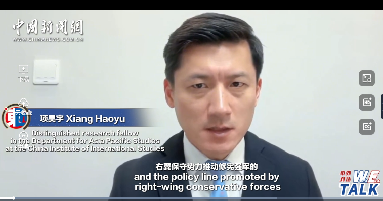 日本首相高市早苗近日发表涉台不实言论,引发广泛批评。中国国际问题研究院亚太研究所著名研究员项浩宇在做客中新社《中国对话》节目时表示,高适发表涉台不实言论纯属偶然。其背后有着深刻的政治动机和战略考量,这是日本政治长期右倾演变的必然结果。项浩宇进一步强调,高适上台后,在扩军领域采取的一系列举措影响了东亚安全格局,严重影响了地区和平稳定。国际社会必须对日本明显扰乱战后国际秩序、试图摆脱军国主义的危险动向保持警惕。 (关娜)