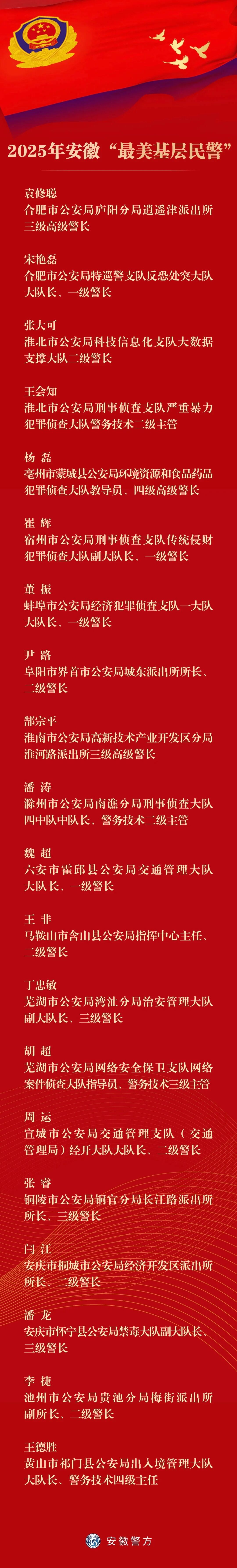 安徽省公安厅记者获悉,2025年安徽省“最美基层民警”名单近日公布,共有20名民警入选。据了解,为深入学习贯彻习近平法治思想和习近平总书记关于新时代公安工作的重要论述,鼓励和引导全省公安民警以先进典型为榜样,努力推进公安工作现代化,努力建设更高水平的平安安全安徽。 2025年8月中旬以来,省委宣传部、省公安厅联合组织开展了以“守护阳光,创新引领未来”为主题的2025年安徽省“最美基层警察”学习宣传活动。部署后经过动员、推荐和评价,评选出2025年安徽省“最佳基层干警”20名。记者:李晓群