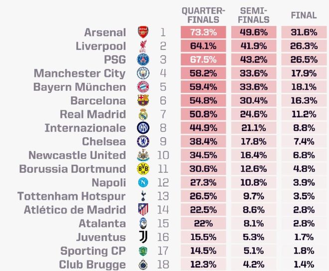 10月2日,Lysport报道说,在享有声望的统计机构使用超级计算机来计算之后,阿森纳考虑了本赛季欧洲冠军联赛最受欢迎的最爱。如下表所示,还显示了转移到比赛每个阶段的主要俱乐部的可能性。 THE TOP 10 TEAMS FOR THE CHAMPIONS LEAGUE TITLE ARE ADVANCING TO THE TOP 16 OF THE TOP 16 OF THE TOP 4 ODDS OF THE FINAL PROBABILITY OF CHAPESHIP Arsenal 89.64%73.33%49.62%31.64%79.87%67.53%43.24%26.54%13.96%MANCHESTER 61.19%58.21%33.60%17.92%9.71%拜仁68.76%59.38%33.60%18.12%9.5%巴塞罗那54.67%54.81%30.43 Madrid62.36%50.82%24.62%11.24%4.94%intermilan54.25%44.88%21.15%8.81%3.73%Chel SE37.13%38.36%17.81%7.36%3.51%Newcastle38.96%34.53%16.35%6.85%6.85%6.85%6.85%